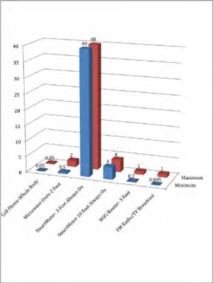 Hirsch found that the cumulative exposure of a smart meter is more than 160 greater than that of a cellphone. Now to be fair, he measured exposure at 3 feet, but look at the chart below to get an idea of just how dangerous AMI smart meters are to public health.